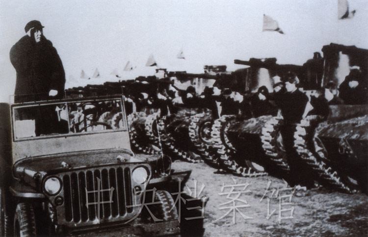 紀錄片:(群眾呼聲)中國人民萬歲?。o錄片解說)檢閱開始了。東北野戰(zhàn)軍參謀長劉亞樓將軍,向毛主席報告受檢閱的部隊全部到齊。坦克塔上飄揚著紅旗,坦克手精神百倍,向著自己的領(lǐng)袖敬禮。